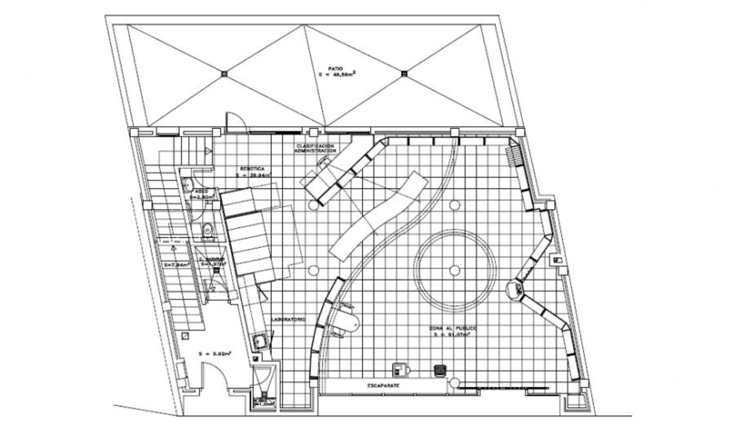 En el proyecto de la farmacia hemos procurado que los productos expuestos tengan gran cantidad de luz indirecta, creando una ambiente agradable y tranquilo. Sus grandes elementos verticales y ligeros nos ayudan a diferenciar varios espacios hacia los que los pies caminan solos, por su poder de atracción.