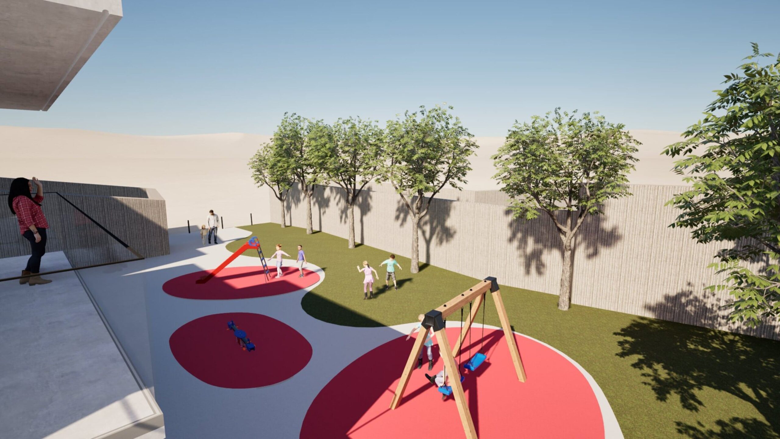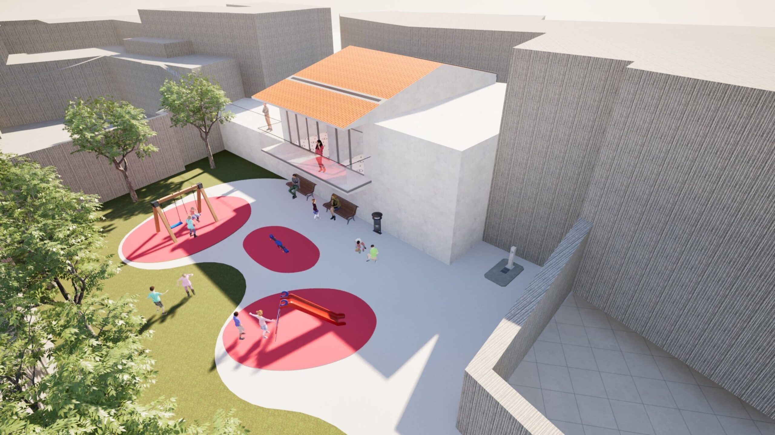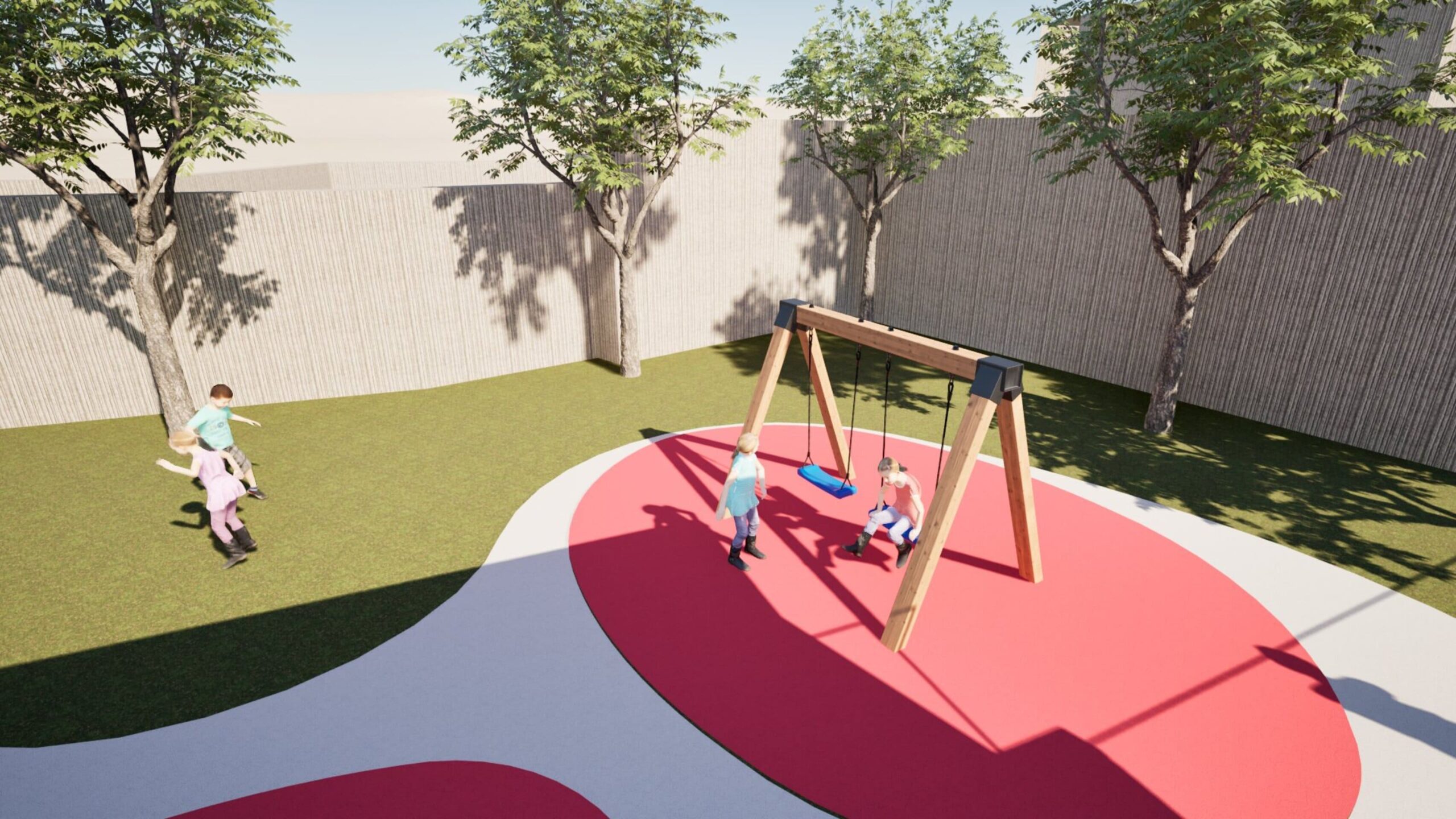 El área de juegos contará con diversos elementos de recreo para diferentes rangos de edad, como un tobogán, un balancín y columpios. Además, también se instalarán bancos.