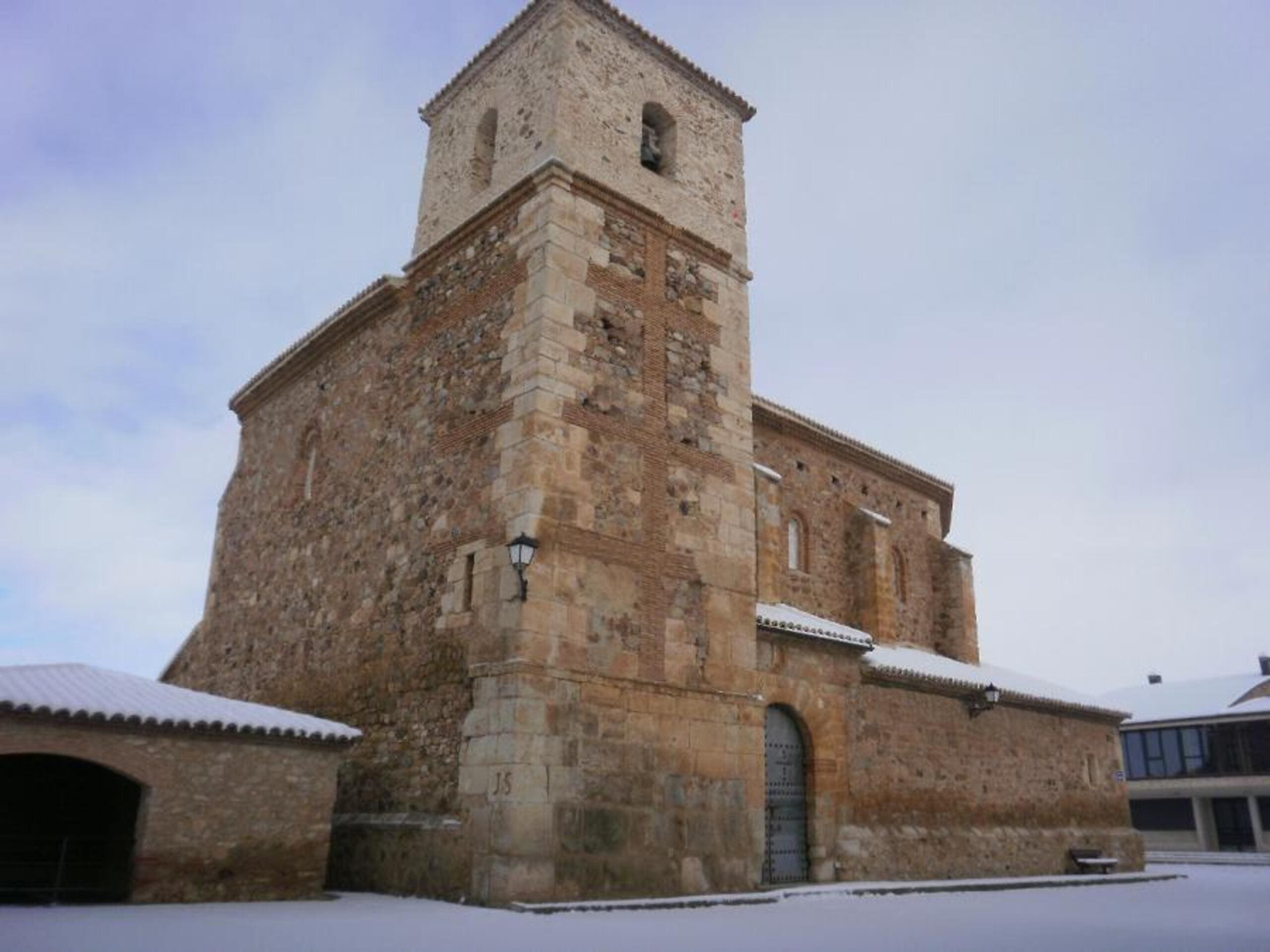 A los pies de la Iglesia, junto a la puerta abierta en arco de medio punto, con grandes dovelas e impostas molduradas, se levanta la torre de planta cuadrada estando parcialmente insertada en la iglesia. Esta realizada en mampostería combinada con franjas de ladrillos y sillares. La torre cuenta con tres cuerpos. Los dos pisos inferiores son de mampostería sobre un zócalo de piedra sillar mientras que el superior es de ladrillo y mampostería, está separado de los inferiores por una imposta de ladrillo aplantillado. Las campanas se encuentran situadas en este último piso.