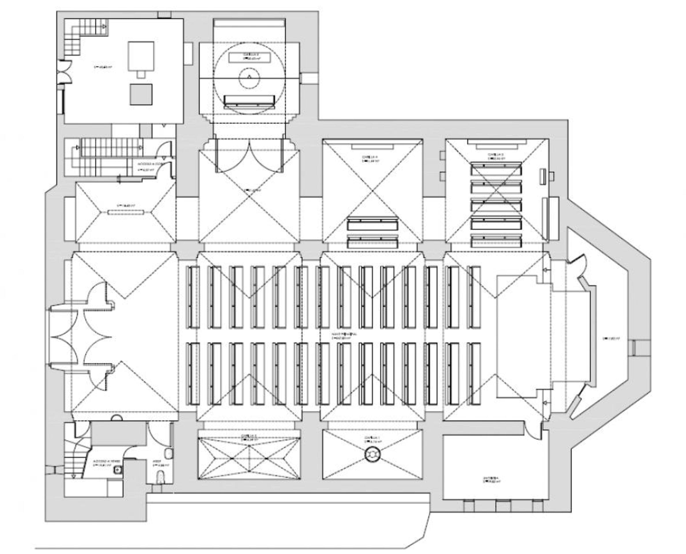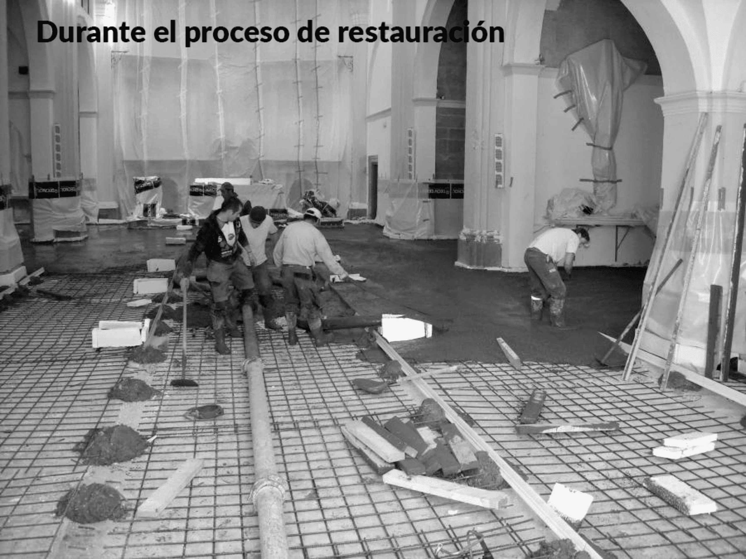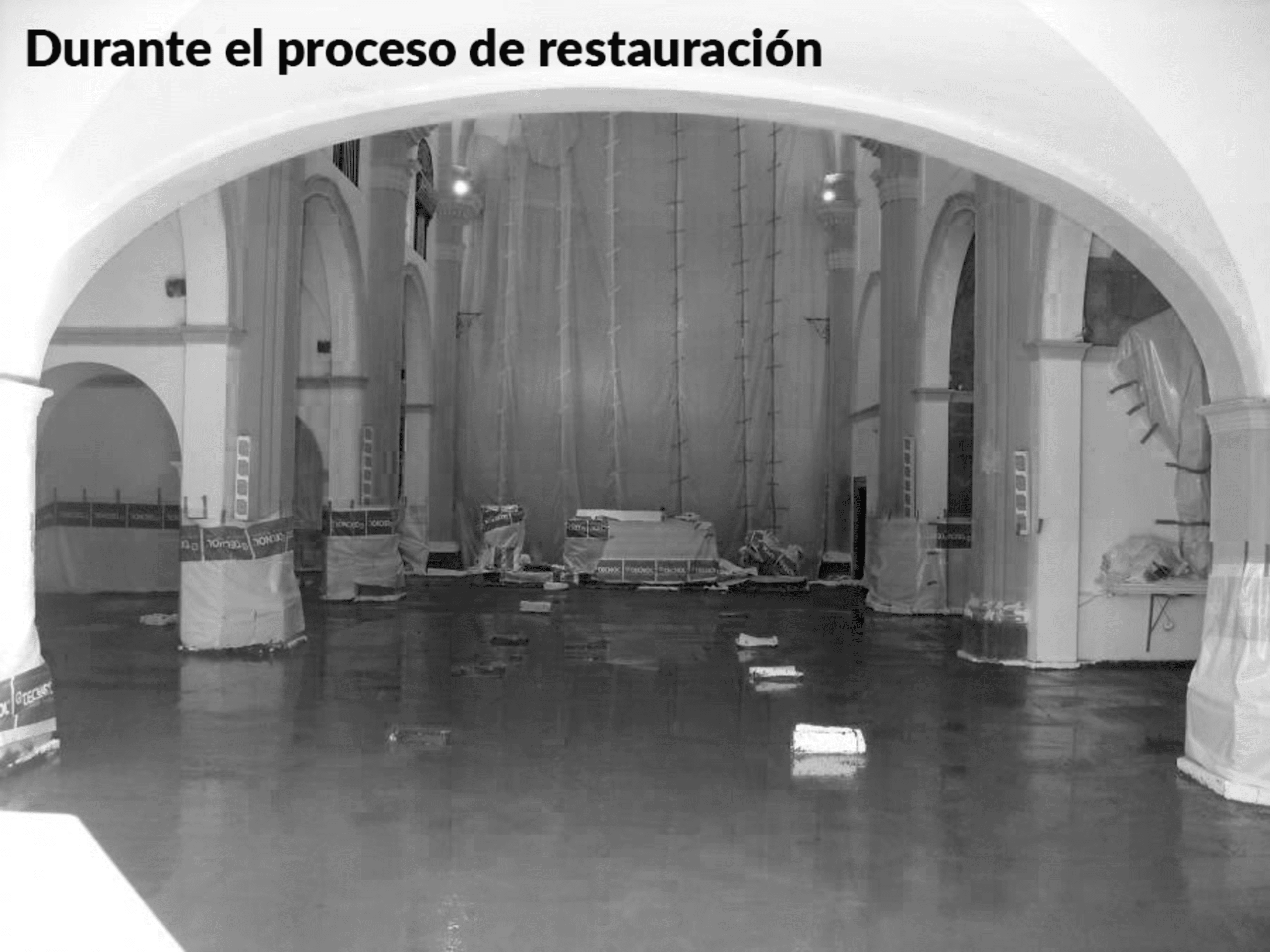 En la intervención realizada hemos proyectado los trabajos de restauración de suelos, paramentos exteriores e interiores así como los de electricidad, megafonía, iluminación y pintura.