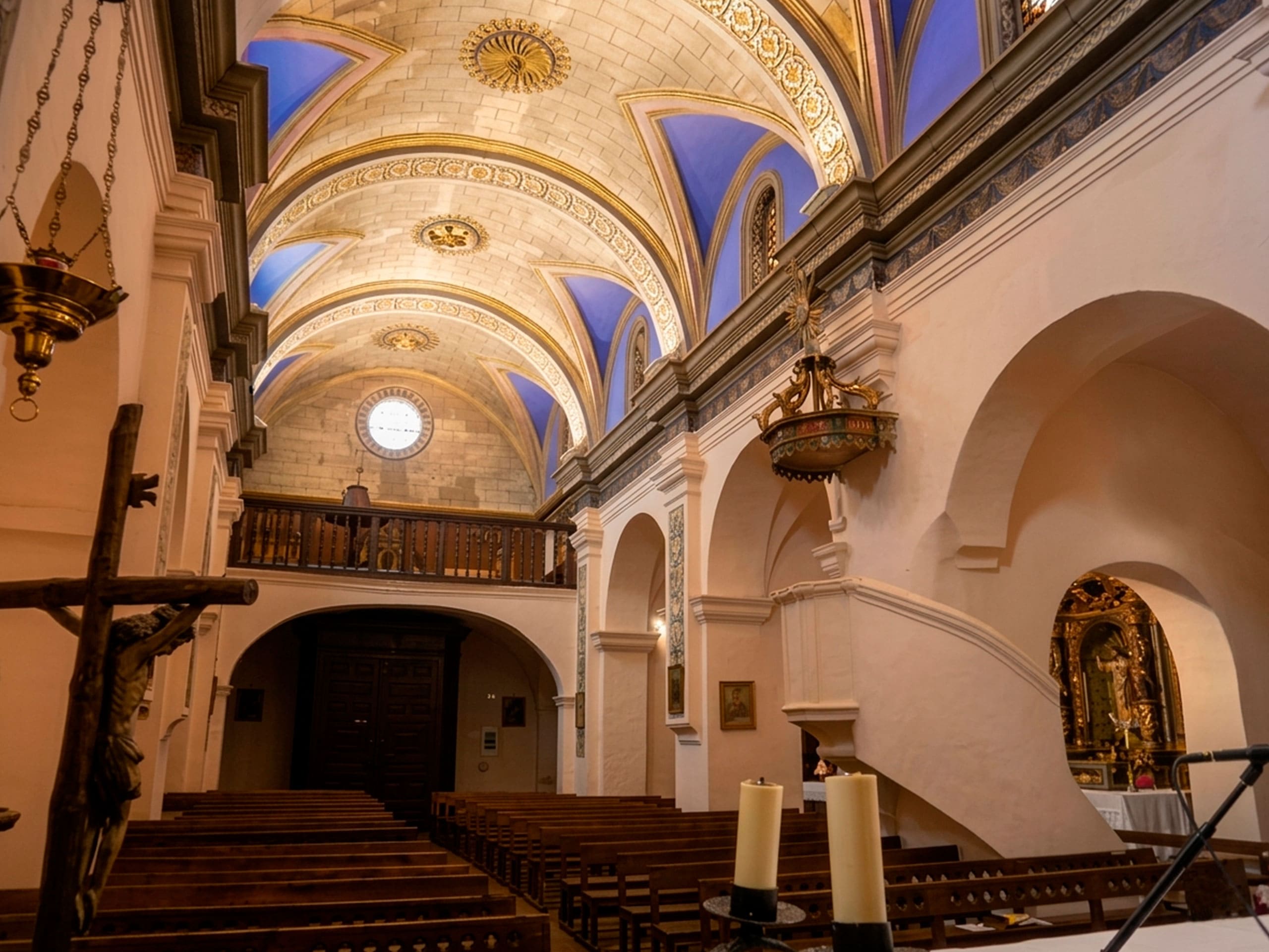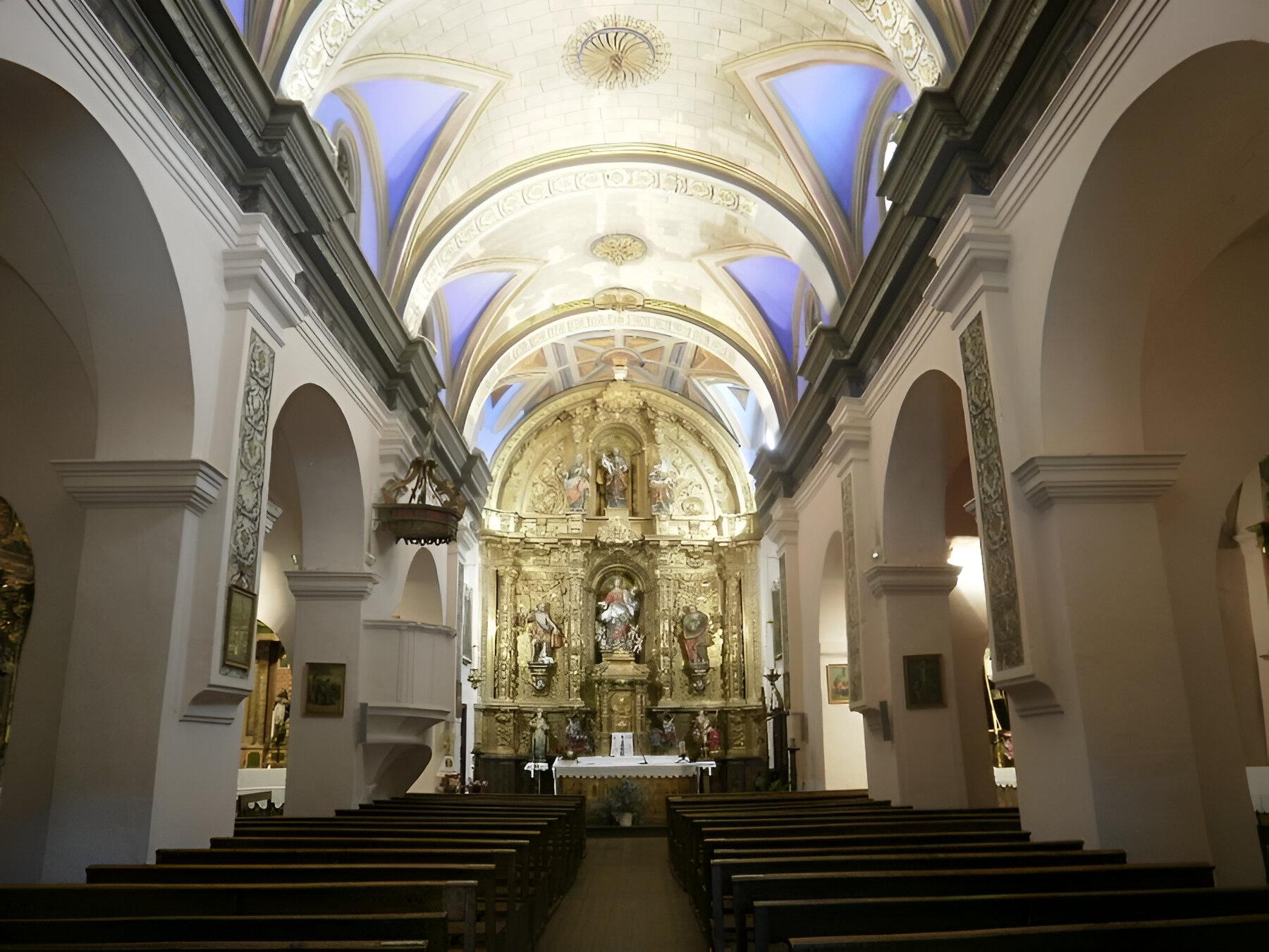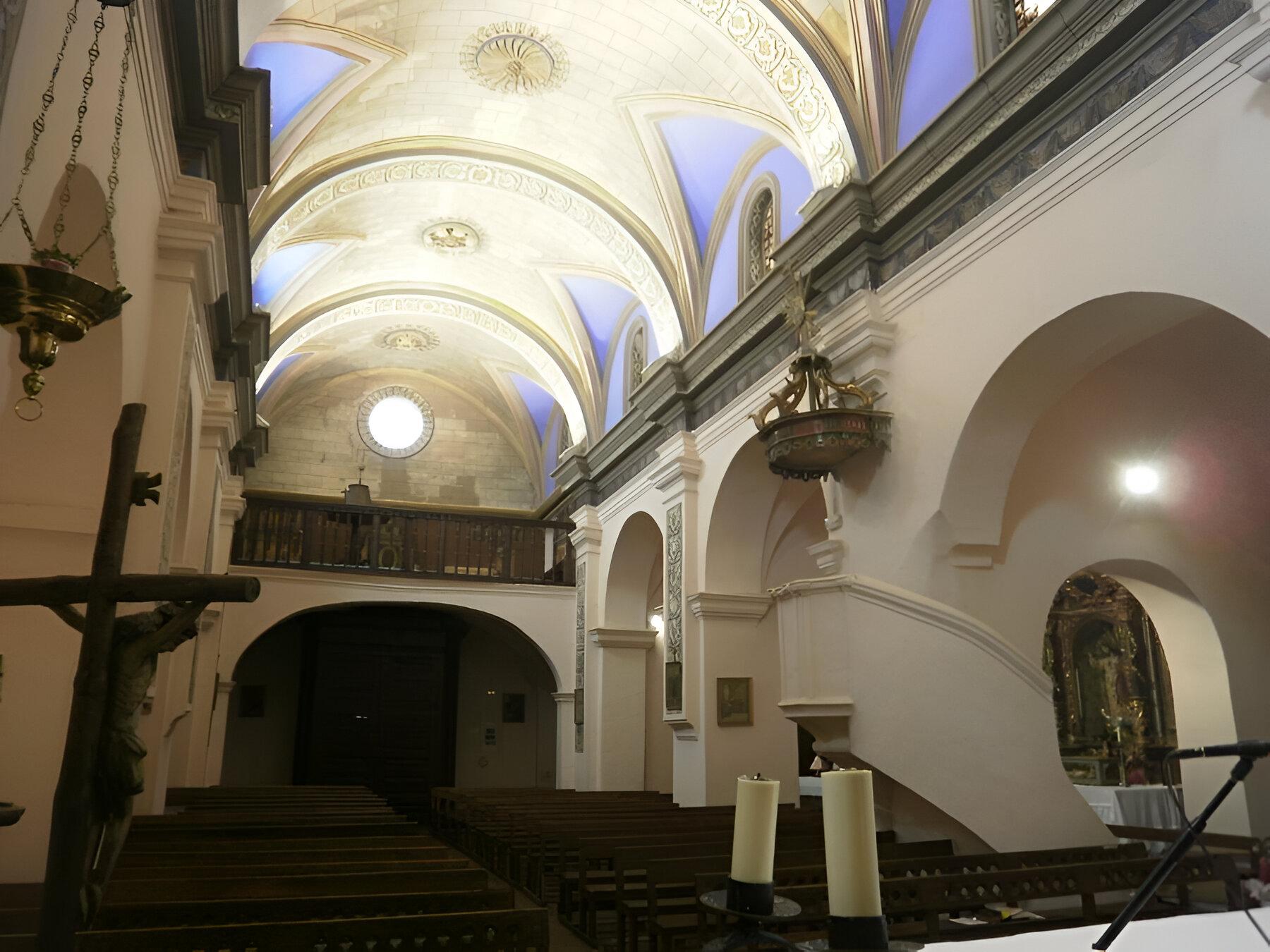 Como quiera que sea, hoy consta de una nave de cuatro tramos de cabecera plana, levemente oblicua al eje principal, con capillas entre los contrafuertes unidas entre sí de modo que parecen formar naves laterales. La nave cubre con bóveda de lunetos sobre arcos fajones que cargan en pilastras y las capillas con bóvedas de aristas. El interior está completamente estucado y pintado. La sacristía es de planta rectangular y se cubre con dos tramos de cañón de lunetos.