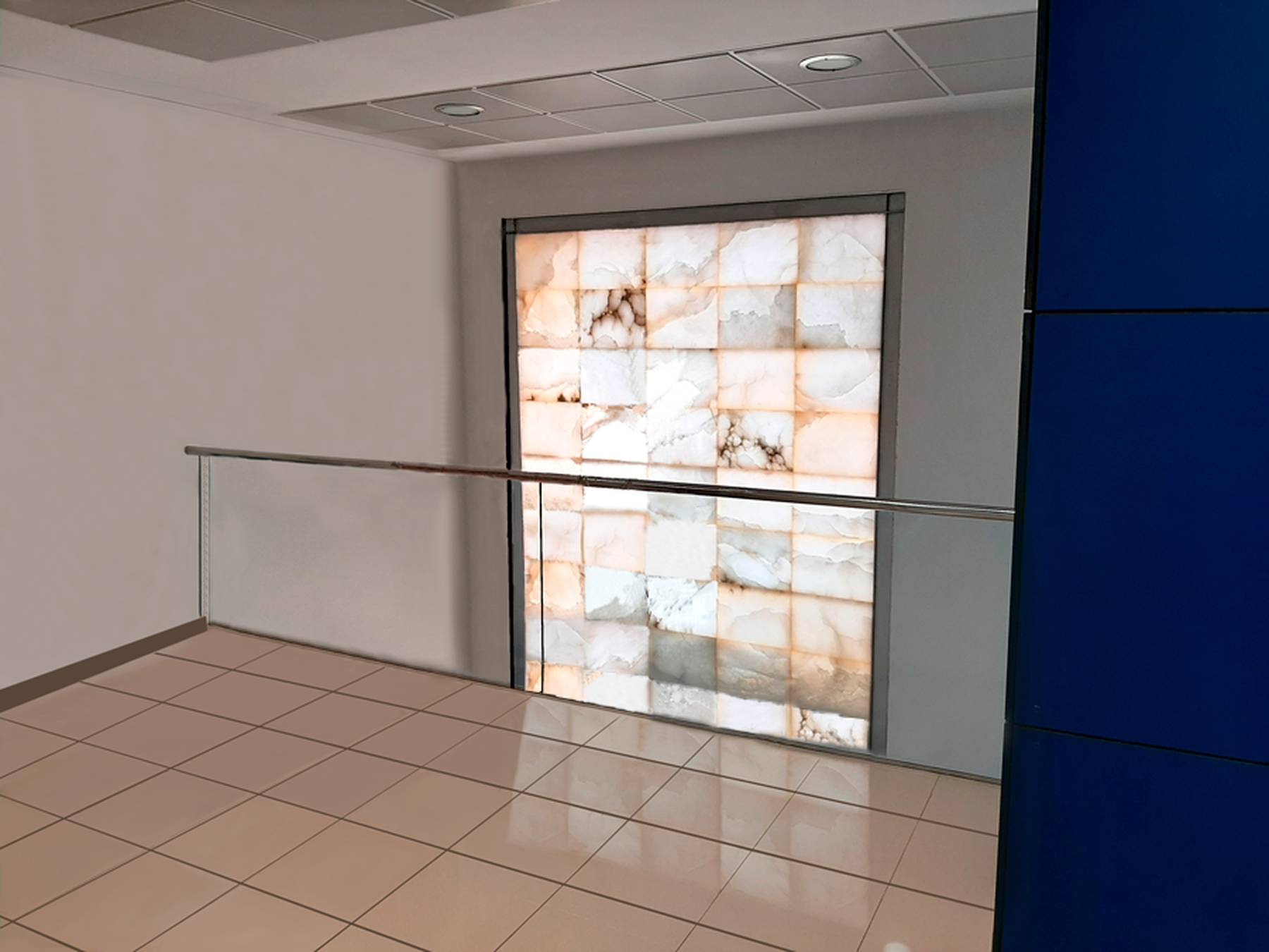 Destaca la formación de un espacio de doble altura como atrio de entrada, que le da amplitud y luz a través de un gran ventanal exterior de alabastro, como material representativo de la zona.