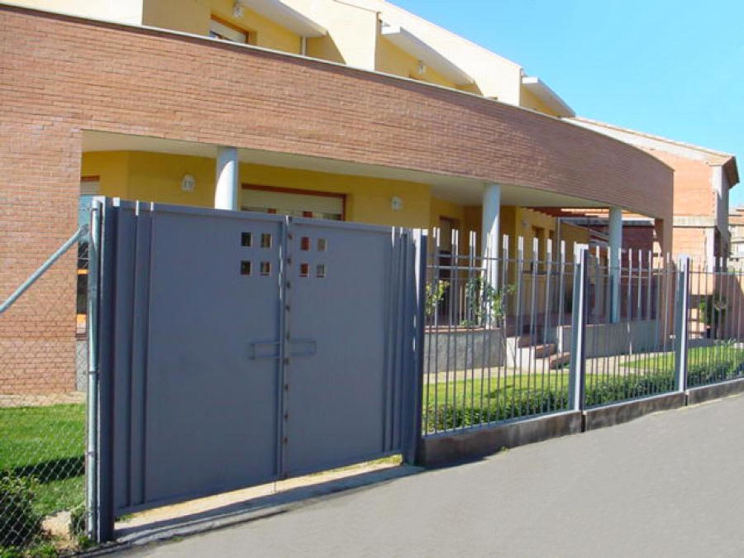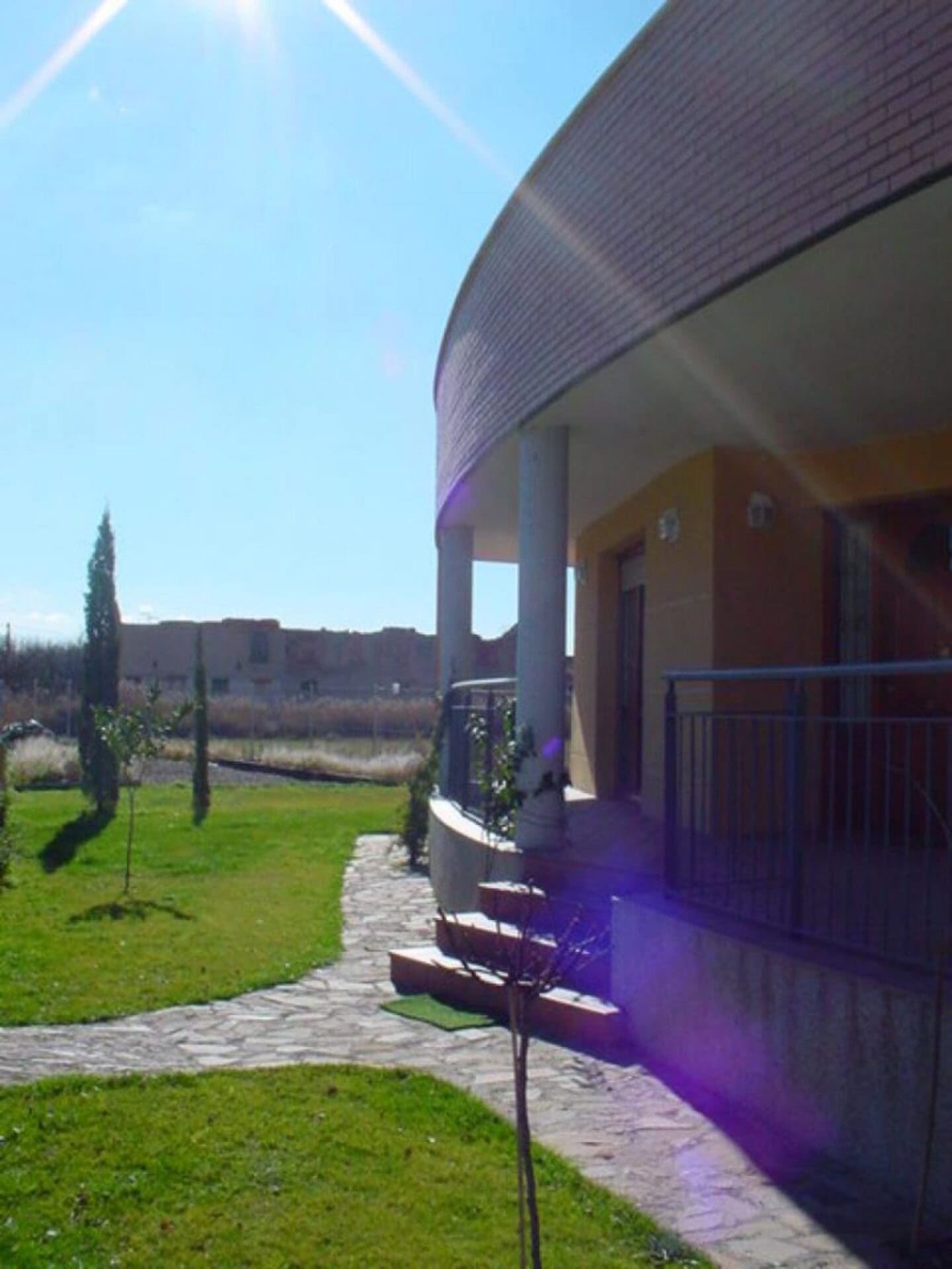 La fachada casi cerrada, la protege del clima y de las molestias de la carretera de acceso.